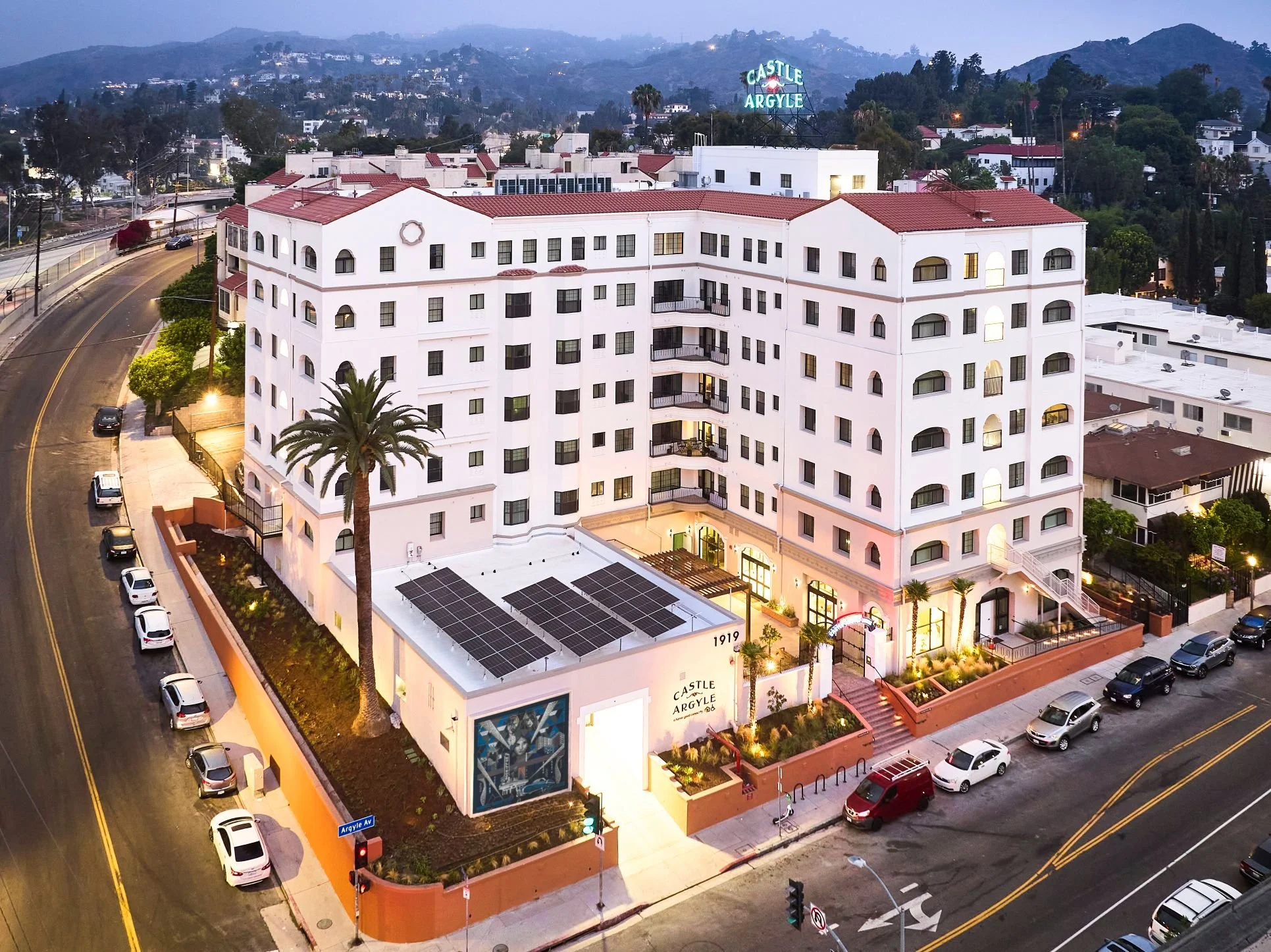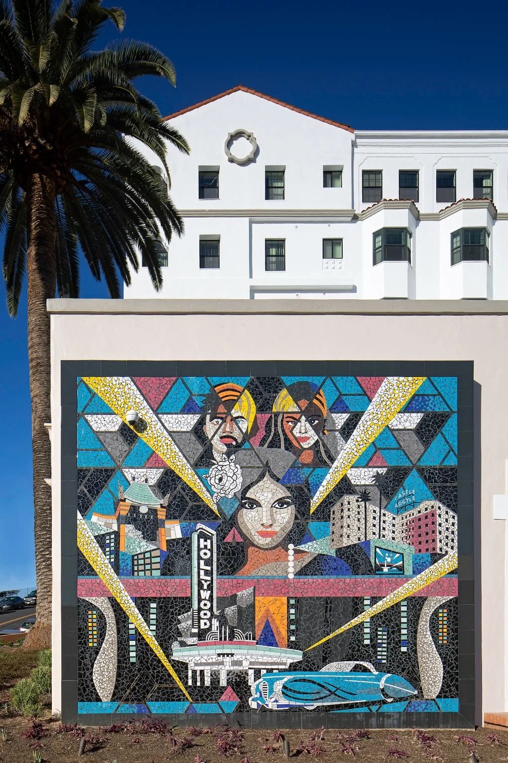 The art program begins on the exterior with a 15-by-15-foot ceramic-tile mosaic mural facing Argyle Avenue. Artist Roberto Biaggi’s figurative mural on the parking structure wall represents the diverse history of Castle Argyle, its residents, and the surrounding community. Biaggi’s abstract lobby mosaic mural, composed of glass tile, celebrates the building’s Hollywood Regency style. Also restored were two historic exterior neon signs that serve as beacons through the Hollywood night sky.