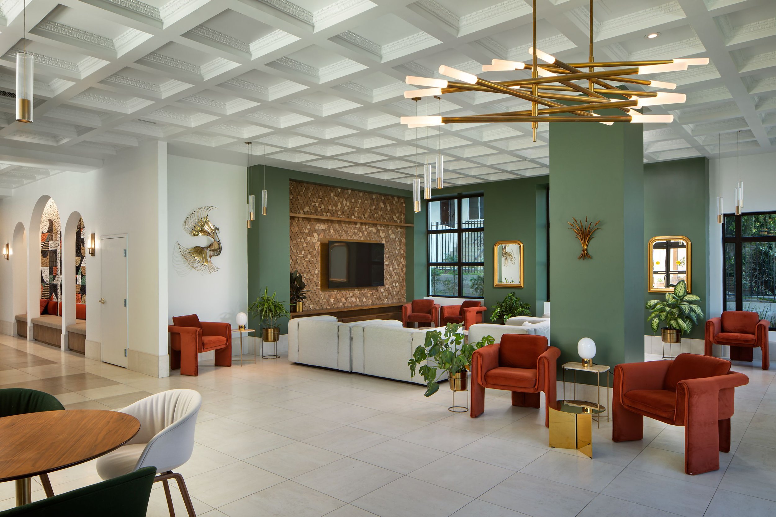 The intent of the renovation was to reveal the building’s classic character and reintroduce its Hollywood Regency origins using colors and patterns of the era, with a subtle contemporary sensibility. This style is one of elegance, opulence, and glamour.