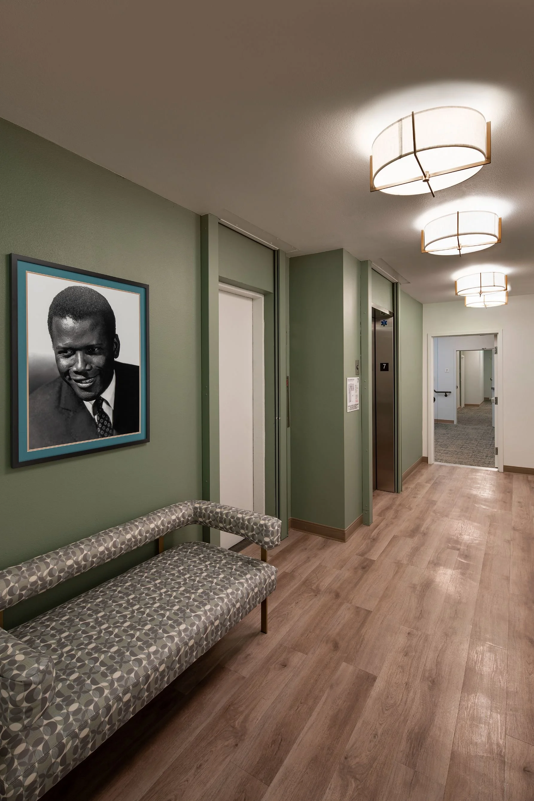 Amidst renovation, the architects uncovered and restored the original coffered ceilings throughout the first floor, which also houses management and tenant-service offices, including a room for on-site medical personnel. Individual units were upgraded with new kitchens, baths, appliances, air conditioning, paint, and flooring.