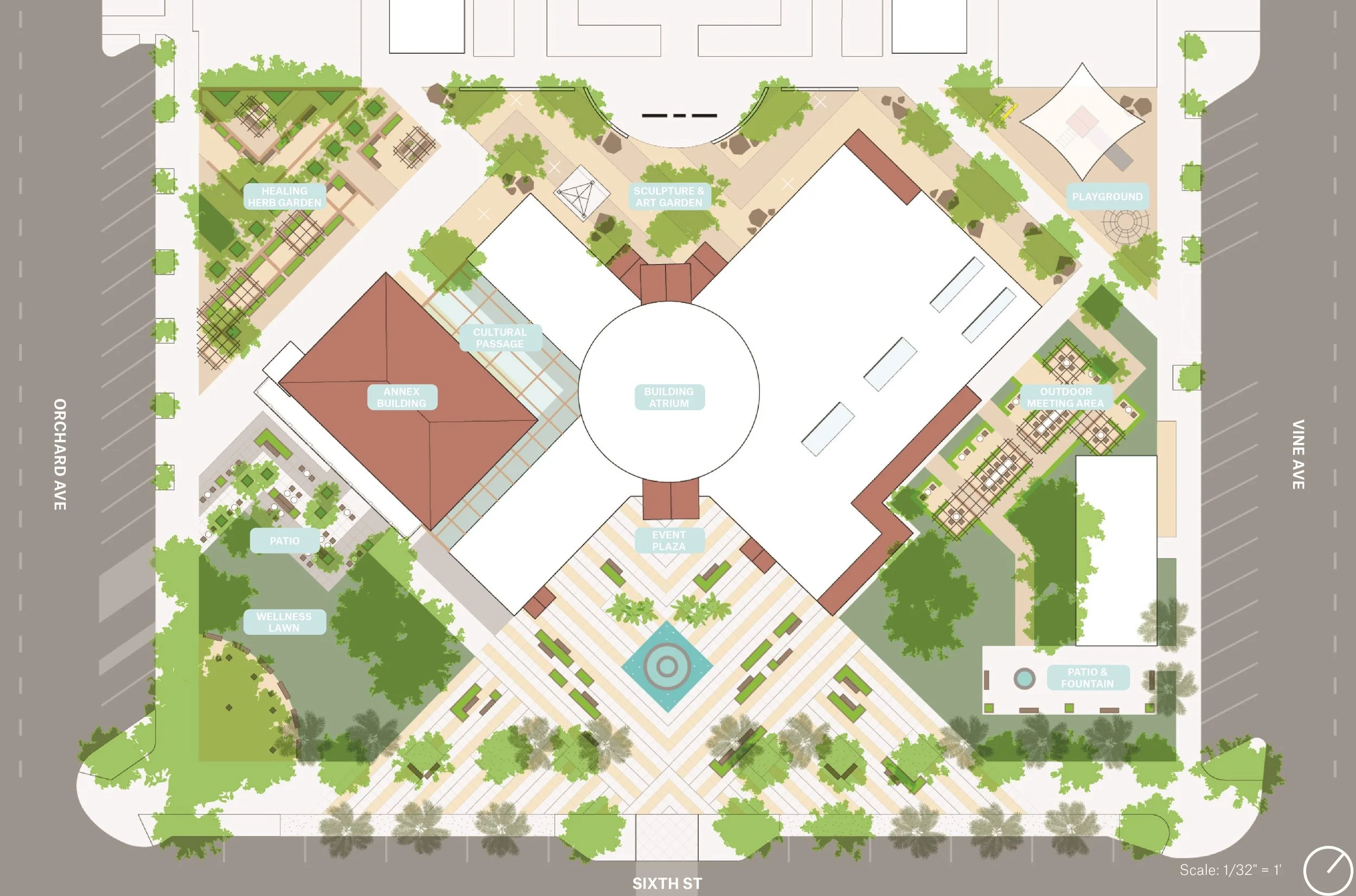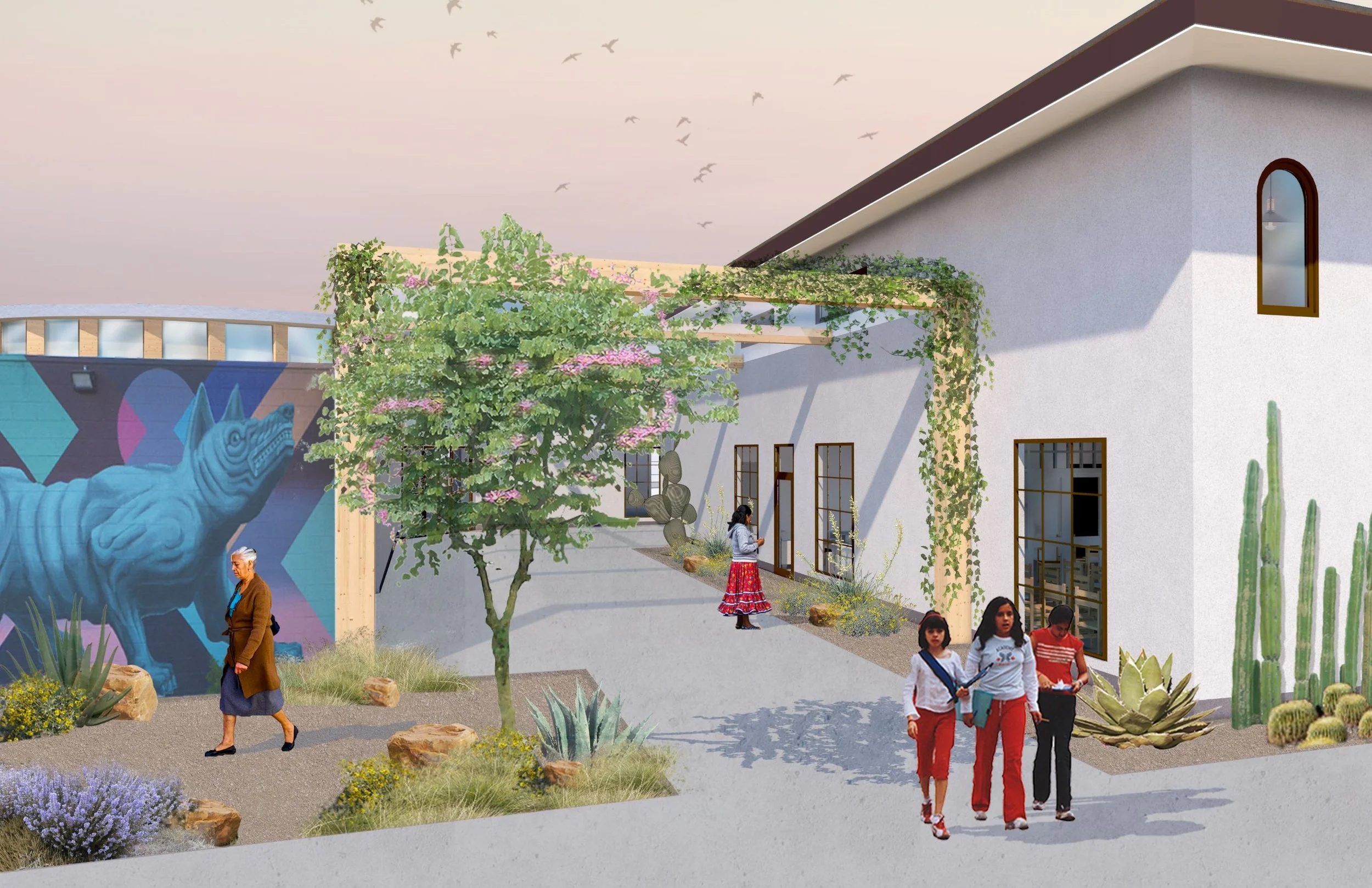 Through multiple outreach events, a program was developed to address the specific needs of this vibrant, multicultural, and largely lower-income population. The proposed scope renovates and expands the City Hall building to provide shared workspace for nonprofits, a multipurpose room for classes and events, a teen center, daycare, co-working space, event hall, and a commercial kitchen for training and food truck/street vendor prep. The expansive site also includes a public plaza, community gardens, sculpture gardens, an art alley, and park space.