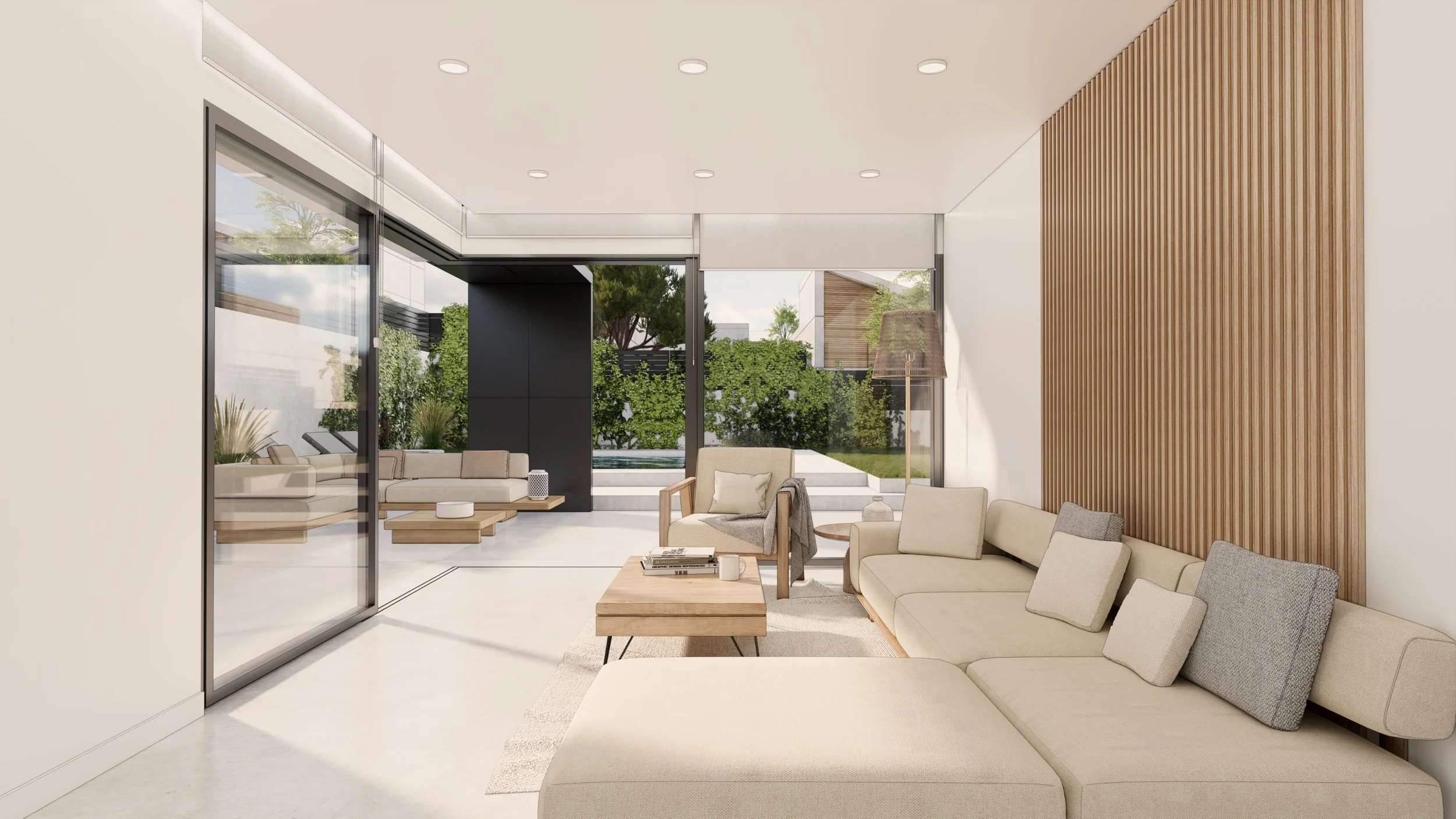 The design prioritizes an open concept, seamlessly integrating indoor and outdoor environments. Expansive glass openings, shaded terraces, and fluid spatial connections invite natural light and mountain views while fostering outdoor-centric living. The private pool and attached carport further enhance convenience and leisure.