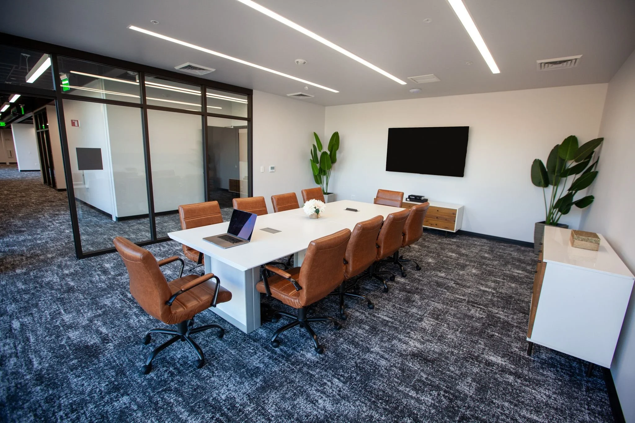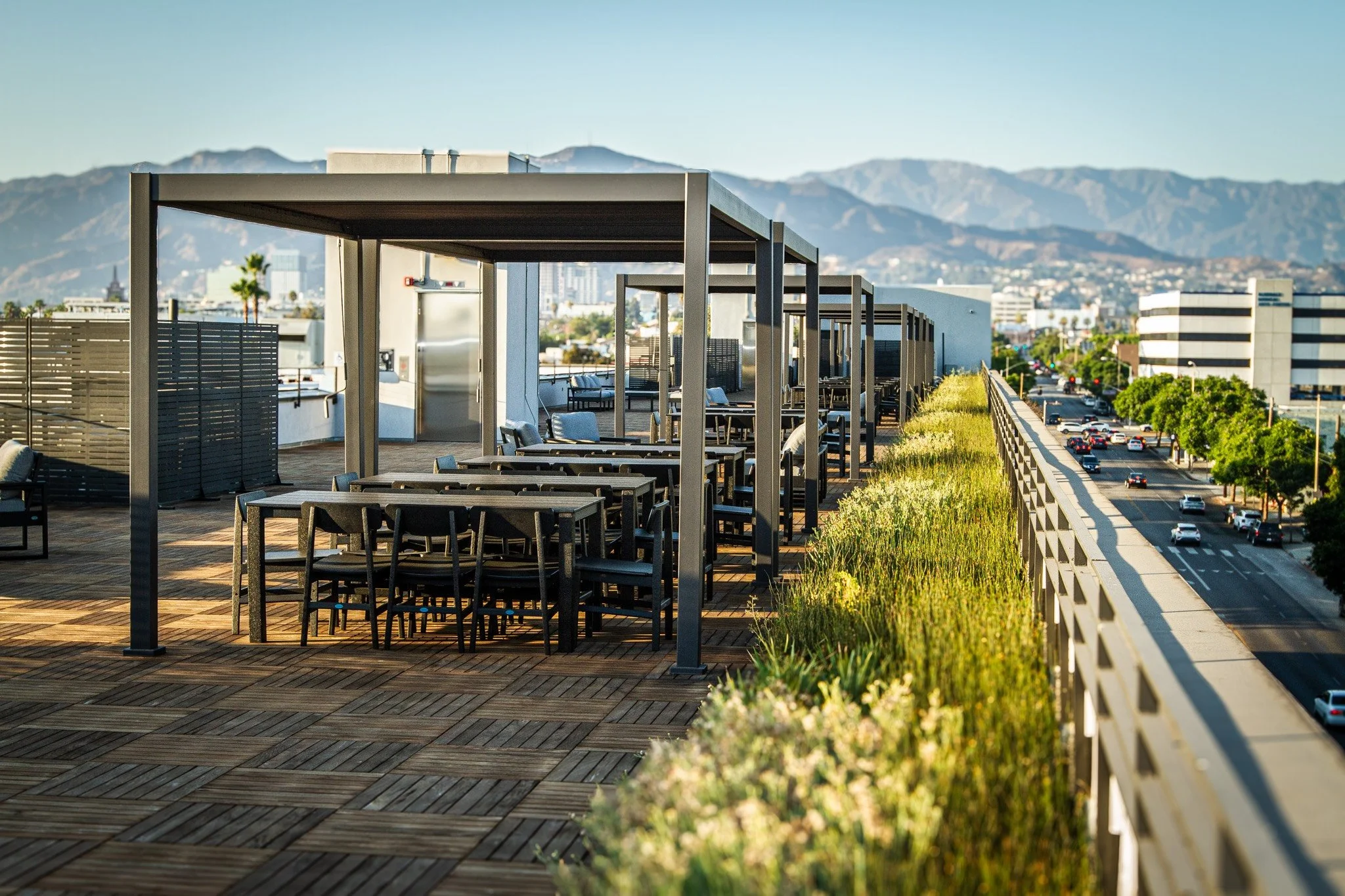 The overall building design is reinforced with premium materials and thoughtful detailing. The vertical wood louvers and glazed curtain wall contrast with the smooth concrete surfaces, creating variation and visual interest. The building's palette is thoughtfully curated with colors and materials that work well together and complement the overall site design.