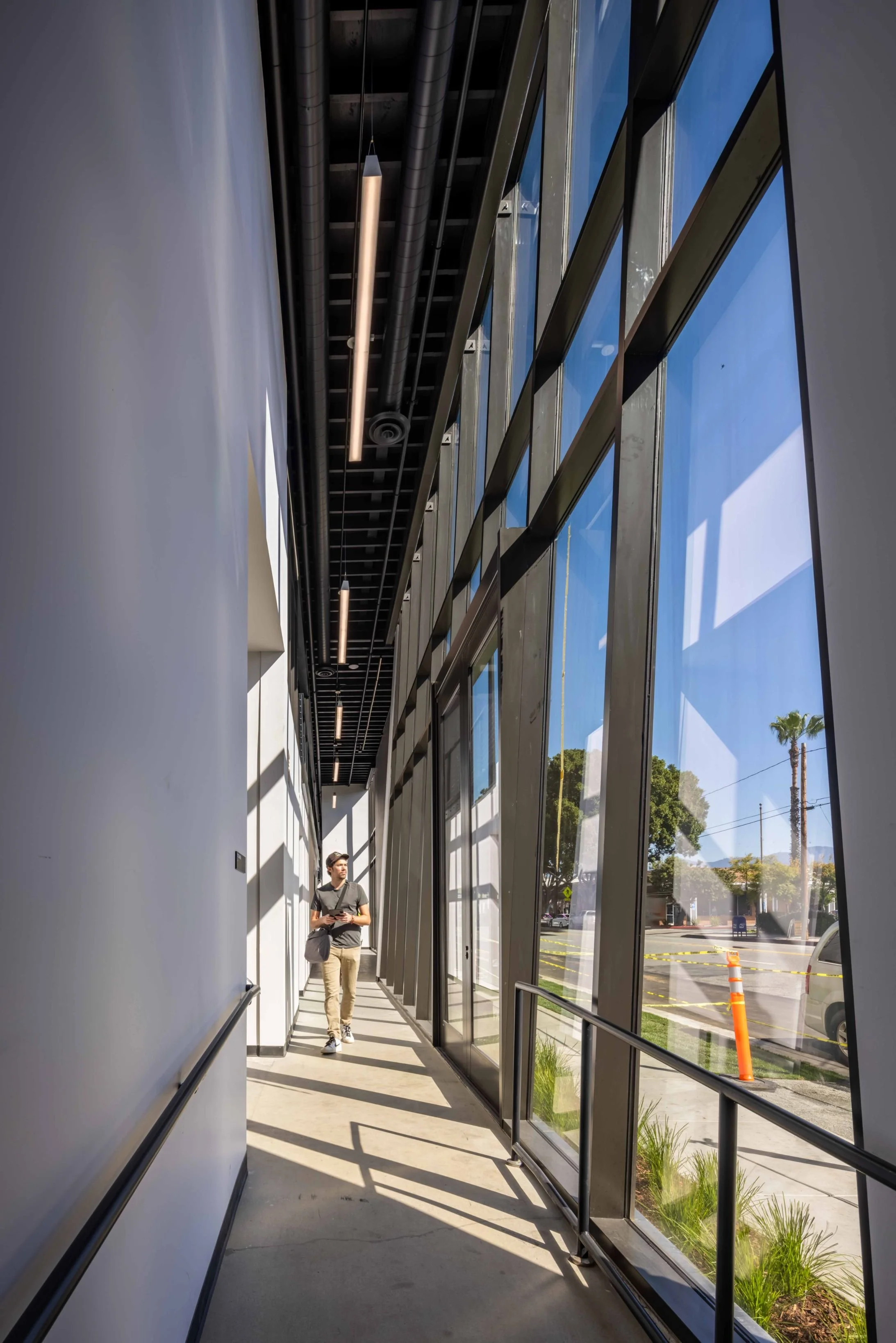 The building is designed to seamlessly integrate with the surrounding site elements while promoting pedestrian activity along Glendale Ave. The main office building along this front facade provides a series of setback areas with built-in planters and benches that integrate with the existing streetscape. These setback areas break up the massing of the building, creating a human-scaled edge that intentionally promotes pedestrian activity and engagement.