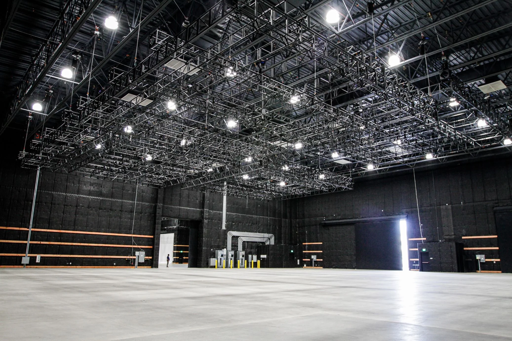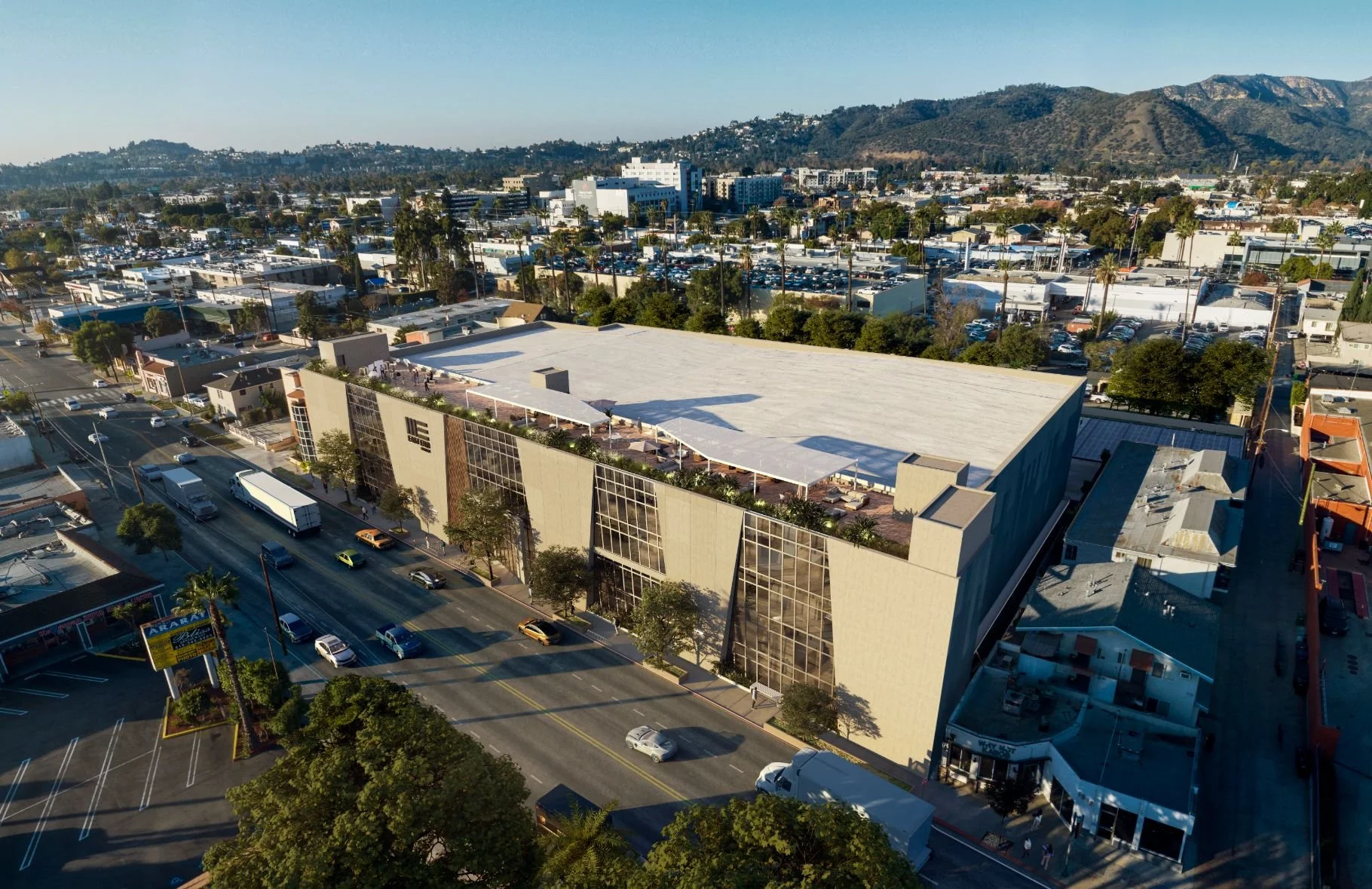 The sound stages feature ancillary uses (green rooms, makeup, etc.), and the offices are designed to fit optimal scales of production. The surface parking is partially covered for an outdoor mill with ample room for staging, trucks, and trailers.