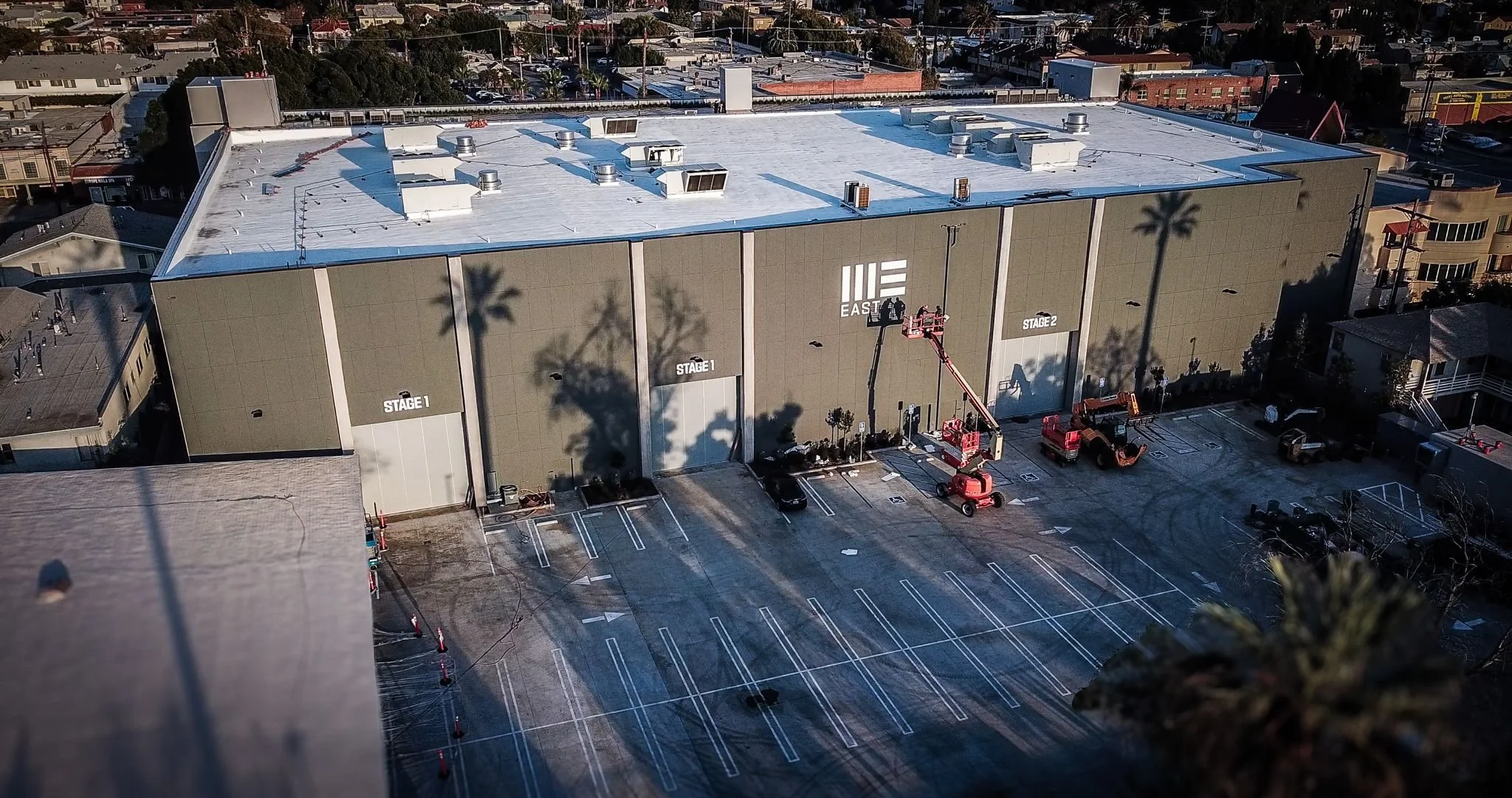 The East End Glendale Campus is an urban production complex northeast of Los Angeles, located on a main thoroughfare that connects directly with Downtown. This site features two newly constructed sound stages adjacent to a surface parking lot, with three stories of office space buffering the private facility from the busy street.